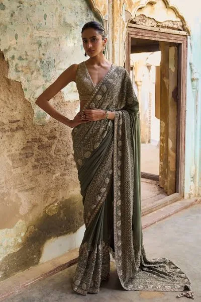 Kanjivaram saree with an intricate zardozi border, paired with a fully embroidered zardozi blouse and a complementing mukaish embroidered patka.